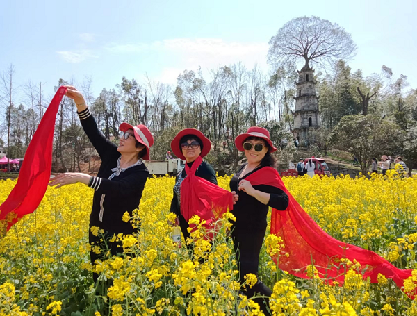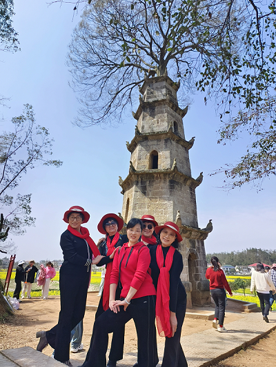 上午10时到达茶亭镇,大家被眼前美丽的花海所吸引,只见油菜花海绵延不绝,满目金黄香百里,一方春色醉千山。大家尽情呼吸着清新的空气,迈着欢快的步伐,结伴而行漫步在花海中,与油菜花合影打卡,将美景化为一张张精致图片,尽享春日里的慢生活。恰逢茶亭花海艺术节期间,望城区花鼓剧团正在举办专场演出,老同志们饶有兴趣的欣赏这场独特的春日视听盛宴。午饭过后,大家结伴散步2km参观有着一百多年历史的惜字塔,因塔顶长了一棵树而成为全国独一无二的一个奇观。
