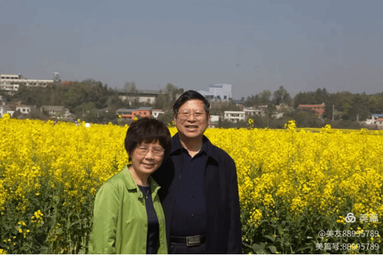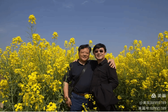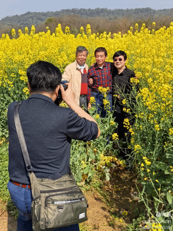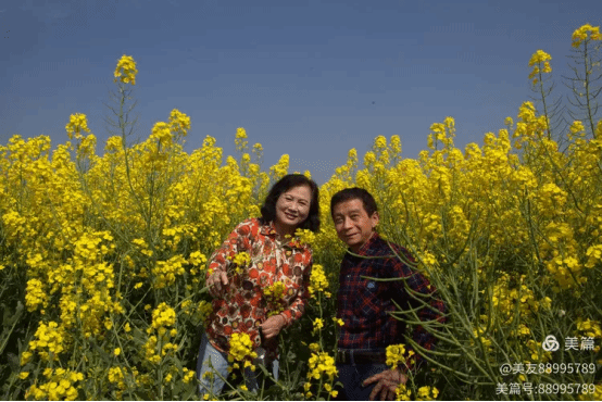 一对对老夫妻站在金黄的油菜花丛中微笑合影。岁月虽然在他们脸上留下了痕迹,但他们的爱情却如同这油菜花一般,历久弥新。